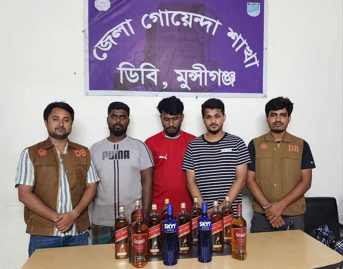 মুন্সিগঞ্জ সদরের পশ্চিম মুক্তারপুর এলাকা থেকে ১২ বোতল বিদেশী মদসহ ৩ যুবককে আটক করেছে জেলা গোয়েন্দা পুলিশ (ডিবি)।পশ্চিম মুক্তারপুর এলাকায় অভিযান পরিচালনা করে ওই ৩ জনকে আটক করা হয়।আটককৃতরা হলেন, পশ্চিম মুক্তারপুর এলাকার তামজীদ বেপারী (২৪), সেলিম মাতবর (২৯) ও মাহবুব হাছান (২৯)।জেলার অতিরিক্ত পুলিশ সুপার (অর্থ ও প্রশাসন) মুহাম্মদ কাজী হুমায়ুন রশিদ প্রেস বিজ্ঞপ্তিতে এ তথ্য জানিয়েছেন।তিনি জানান, ডিবি পুলিশের একটি টিম গোপন সংবাদের ভিত্তিতে পশ্চিম মুক্তারপুর সাকিনস্থ জনৈক হুমায়ন কবিরের চায়ের দোকানের সামনের পাঁকা রাস্তায় অভিযান পরিচালনা করে। এসময় অভিযুক্ত তামজীদ বেপারী ও সেলিম মাতবরকে তল্লাশিকালে ২ লিটার বিদেশী মদ ও তাদের দেয়া তথ্যমতে রাত আনুমানিক সোয়া ১টার দিকে অপর অভিযুক্ত মাহবুব হাছানের (২৯) বসতঘর এর ওয়ারড্রবের ভিতর একটি কাপড়ের ব্যাগের মধ্যে রক্ষিত অবস্থায় ১০ লিটার বিদেশী মদ জব্দ করা হয়।তিনি জানান, অভিযুক্তদের বিরুদ্ধে মুন্সিগঞ্জ থানায় এজাহার দায়ের এবং মামলা রুজুর কার্যক্রম প্রক্রিয়াধীন।