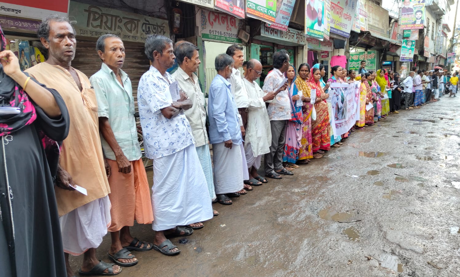 পিরোজপুর সদর উপজেলার জুজখোলা সম্মিলিত বহুমুখী মাধ্যমিক বিদ্যালয়ের প্রধান শিক্ষক বিপুল মৈত্রকে হাতুড়িপেটা করে হাত-পা ভেঙে দেওয়ার ঘটনার সাথে জড়িতদের বিচারের দাবিতে মানববন্ধন অনুষ্ঠিত হয়েছে।শনিবার (২৭ সেপ্টেম্বর) বিকেলে পিরোজপুর শহরের টাউন ক্লাব সড়কে এ মানববন্ধনের আয়োজন করা হয়। এতে হামলার শিকার বিপুল মৈত্রের স্ত্রী কবিতা, বিদ্যালয়টির শিক্ষকমন্ডলী ও স্থানীয় জনসাধারণ অংশ নেয়।মানববন্ধনে বিদ্যালয়টির ম্যানেজিং কমিটির সভাপতি ও জেলা বিএনপি'র যুগ্ম আহবায়ক এলিজা জামান বলেন, একজন শিক্ষকের ওপর এমন বর্বরোচিত হামলা কোনোভাবেই গ্রহণযোগ্য নয়। তিনি হামলাকারীদের দ্রুত শনাক্ত করে দৃষ্টান্তমূলক শাস্তি নিশ্চিতের জন্য সরকারের কাছে দাবি জানান।এসময় অন্যান্য বক্তারা বলেন, শিক্ষক সমাজের নিরাপত্তা নিশ্চিত না হলে শিক্ষাঙ্গনে অস্থিরতা দেখা দেবে।তাই শিক্ষকের উপর হামলাকারীদের দৃষ্টান্তমূলক শাস্তির দাবি জানান বক্তারা। উল্লেখ্য, গত বৃহস্পতিবার বিকেলে বিদ্যালয় থেকে পিরোজপুর শহরে ফেরার পথে পিরোজপুর-নাজিরপুর সড়কের ঝরঝরিয়াতলা নামক স্থানে দুর্বৃত্তরা বিপুল মৈত্রের পথরোধ করে তাকে হাতুড়িপেটা করে। এ সময় তার পা ও ডান হাত ভেঙে যায়। বর্তমানে তিনি গুরুতর আহত অবস্থায় ঢাকায় চিকিৎসাধীন রয়েছেন। এ ঘটনায় পিরোজপুর সদর থানায় একটি মামলা দায়ের হওয়ার পর পুলিশ একজনকে গ্রেফতার করেছে। বিদ্যালয়টির ম্যানেজিং কমিটি গঠন নিয়ে স্থানীয় দুইটি পক্ষের মধ্যে বিরোধ ছিল। এ বিরোধের জেরে হামলার ঘটনা ঘটতে পারে বলে ধারণা করা হচ্ছে।