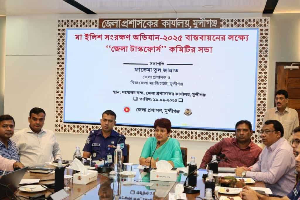 মুন্সিগঞ্জ মা ইলিশ সংরক্ষণ অভিযান-২০২৫ সফল করতে আগামী ৪ অক্টোবর থেকে ২২ দিন মুন্সীগঞ্জের সকল নদীতে বালু উত্তোলন সম্পূর্ণ নিষিদ্ধ ঘোষণা করা হয়েছে।সোমবার সকালে জেলা প্রশাসকের কার্যালয়ের সম্মেলন কক্ষে জেলা প্রশাসক ফাতেমা তুল জান্নাতের সভাপতিত্বে অনুষ্ঠিত জেলা টাস্কফোর্স কমিটির সভায় এ সিদ্ধান্ত নেওয়া হয়।অতিরিক্ত জেলা প্রশাসক (সার্বিক) ফয়সাল হক জানান, সরকারের সিদ্ধান্ত অনুযায়ী আগামী ৪ থেকে ২৫ অক্টোবর পর্যন্ত ইলিশ ধরা, পরিবহন, বাজারজাত ও মজুদ নিষিদ্ধ থাকবে। একই সময়ে জেলার মেঘনায় ইজারাকৃত বালুমহাল ছাড়াও আশপাশের সব নদীতে বালু উত্তোলন বন্ধ রাখতে হবে।সভায় উপস্থিত ছিলেন অতিরিক্ত জেলা ম্যাজিস্ট্রেট মো. রেজাউল করিম, অতিরিক্ত জেলা প্রশাসক মুহাম্মদ মুছাব্বেরুল ইসলাম, অতিরিক্ত পুলিশ সুপার (অর্থ ও প্রশাসন) মোহাম্মদ কাজী হুমায়ুন রশীদ, জেলা মৎস্য কর্মকর্তা গোলাম মেহেদী হাসান, সেনাবাহিনী ও কোস্টগার্ড প্রতিনিধি, মৎস্য-পেশাজীবীসহ সরকারি বিভিন্ন দপ্তরের কর্মকর্তা। উপজেলা নির্বাহী অফিসারবৃন্দও অনলাইনে সভায় যুক্ত ছিলেন।সভায় মা ইলিশ সংরক্ষণে কঠোর নজরদারি এবং জনসচেতনতামূলক প্রচারণা চালানোর নির্দেশনা দেওয়া হয়।