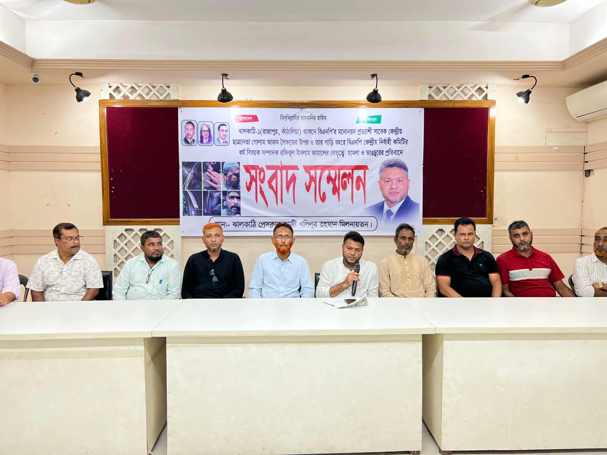 ঝালকাঠি-রাজাপুর,কাঁঠালিয়া ১আসনে বিএনপি'র মনোনয়ন প্রত্যাশী সাবেক কেন্দ্রীয় ছাত্রনেতা গোলাম আজম সৈকতের গাড়িবহরে হামলা ও ভাঙচুরের প্রতিবাদে সংবাদ সম্মেলন অনুষ্ঠিত হয়েছে। রবিবার (১২ অক্টোবর) দুপুরে ঝালকাঠি প্রেসক্লাব কাজী খলিলুর রহমান মিলনায়তনে সংবাদ সম্মেলন করেন কেন্দ্রীয় ছাত্রনেতা গোলাম আজম সৈকত।সংবাদ সম্মেলন গোলাম আজম সৈকত অভিযোগে বলেন,বিএনপির ভারপ্রাপ্ত চেয়ারম্যান তারেক রহমান ঘোষিত রাষ্ট্র সংস্কারের ৩১ দফা কর্মসূচির লিফলেট বিতরণ শেষে বাড়ি ফেরার পথে তার গাড়ি বহরে বিএনপি কেন্দ্রীয় নির্বাহী কমিটির ধর্ম বিষয়ক সম্পাদক রফিকুল ইসলাম জামালের নেতৃত্বে একদল লোক হামলা ও গাড়ি ভাঙচুরে।গত শনিবার ১১ অক্টোবর দিবাগত রাত ১২টার দিকে উপজেলার গালুয়া ইউনিয়নের পুটিয়াখালী মিরের হাট সংলগ্ন সোনালী মোড়ে এই হামলাা সংঘর্ষের ঘটনা ঘটে। এই হামলায় বিএনপি ও শ্রমিক দলের অন্তত ১০ জন নেতাকর্মী আহত হয়েছেন। অভিযোগ করেন পরিকল্পিত ভাবে রফিকুল ইসলাম জামালের অনুসারীরা তার উপর হামলা করেছে।গোলাম আজম সৈকত আরো অভিযোগ করেন, ২০২৪শে ৫ আগস্ট স্বৈরাচার হাসিনা সরকার পালিয়ে গেলেও আওয়ামী লীগের দোসর দের পূনবাসন করতে রফিকুল ইসলাম জামাল রাজাপুর ও কাঠালিয়ায় তাদের নিয়ে বিএনপির রাজনীতি করছে। তিনি আরো বলেন. প্রতিদিনের মতো লিফলেট বিতরণ শেষে নেতাকর্মীদের নিয়ে গাড়ি বহরে নিজ বাড়ি ফেরার সময়ে একই পথে সে সময় কেন্দ্রীয় নির্বাহী কমিটির ধর্মবিষয়ক সম্পাদক রফিকুল ইসলাম জামালের গাড়িবহরও চলছিল। এসময় জামালের অনুসারীরা আমার গাড়িবহর অতিক্রম করার সময় অতর্কিত ভাষায় গালাগালি করে এক পর্যায়ে তারা আমাদেও উপর হামলা চালায়।এ হামলার তীব্র প্রতিবাদ জানিয়ে বিএনপির ভারপ্রাপ্ত চেয়ারম্যান তারেক রহমান সুদৃষ্টি কামনা করেছেন।সংবাদ সম্মেলনে রাজাপুর ও কাঠালিয়া বিএনপি'ও নেতাকর্মীরা উপস্থিত ছিলেন।