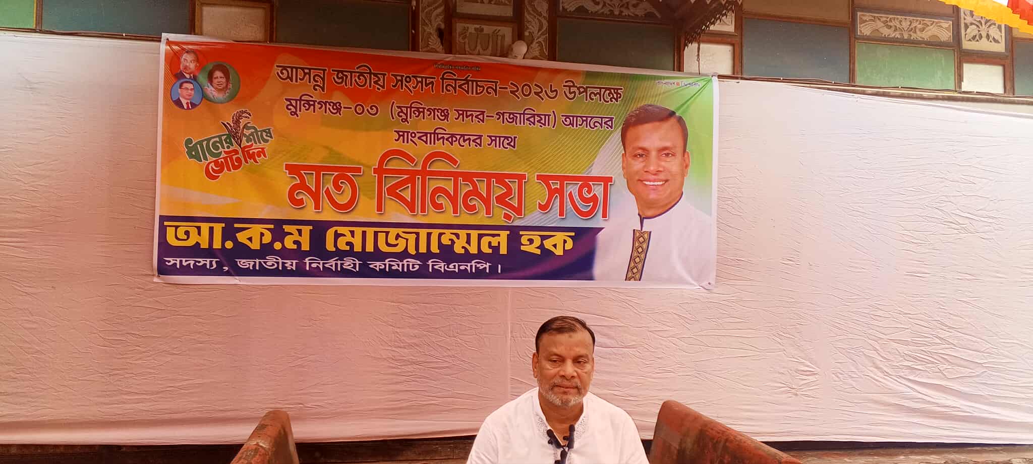 মুন্সীগঞ্জে গজারিয়া উপজেলা আসন্ন জাতীয় সংসদ নির্বাচন ২০২৬ইং উপলক্ষ্যে মুন্সীগঞ্জ-৩(সদর-গজারিয়া) আসনে মনোনয়ন প্রত্যাশী বিএনপি'র জাতীয় নির্বাহী কমিটির সদস্য আ,ক,ম মোজাম্মেল হক মত বিনিময় করেছেন স্থানীয় সাংবাদিকদের সাথে। গজারিয়া উপজেলার বালুয়াকান্দী ইউনিয়নের বালুয়াকান্দীতে তাঁর নিজ বাড়ীতে এই মত বিনিময় সভা অনুষ্ঠিত হয়।এ সময় তিনি জানান,দল তাঁকে মনোনয়ন না দিলেও দলীয় প্রার্থীর পক্ষে কাজ করে বিজয়ী করে তুলবেন সেই লক্ষ্যে বিএনপি'র ভারপ্রাপ্ত চেয়ারম্যান তারেক রহমান কর্তৃক উপস্থাপিত রাষ্ট্র কাঠামো মেরামতের ৩১ দফা বাস্তবায়নে মুন্সীগঞ্জ ৩আসনের সা:মানুষের মাঝে সচেতনতায় লিফলেট বিতরণ ও গণ সংযোগ করে যাচ্ছেন। দল মনোনয়ন দিলে মুন্সীগঞ্জ ৩(গজারিয়া- মুন্সীগঞ্জ সদর)আসনকে উন্নত,সমৃদ্ধ একটি এলাকা হিসেবে গড়ে তুলা হবে।