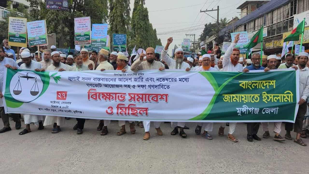 মুন্সীগঞ্জ জুলাই জাতীয় সনদ বাস্তবায়নের আদেশ জারি ও নভেম্বরের মধ্যে গণভোট আয়োজনসহ পাঁচ দফা দাবিতে মুন্সীগঞ্জে বিক্ষোভ মিছিল ও সমাবেশ করেছে বাংলাদেশ জামায়াতে ইসলামী কেন্দ্রীয় কর্মসূচির অংশ হিসেবে জেলা জামায়াতের আয়োজনে শহরের কৃষি ব্যাংক সংলগ্ন জেলা কার্যালয়ের সামনে থেকে একটি বিক্ষোভ মিছিল বের হয়। মিছিলটি শহরের বিভিন্ন সড়ক প্রদক্ষিণ শেষে কোর্ট চত্বরে গিয়ে শেষ হয়। এর আগে জামায়াত কার্যালয়ের সামনে সংক্ষিপ্ত সমাবেশ অনুষ্ঠিত হয়।জেলা সেক্রেটারি ফখরুদ্দিন রাজীর সঞ্চালনায় সমাবেশে প্রধান অতিথি ছিলেন জামায়াতে ইসলামী মুন্সীগঞ্জ জেলা আমির আ. জ. ম. রুহুল কুদ্দুস। বিশেষ অতিথি হিসেবে বক্তব্য রাখেন নায়েবে আমির নুরুল হক পাটোয়ারি ও পৌর আমির এইচ. এম. বাইজীদ।বক্তারা বলেন, “জুলাই জাতীয় সনদ বাস্তবায়ন দেশের জনগণের ন্যায্য দাবি। নভেম্বরের মধ্যে গণভোটের মাধ্যমে জনগণের মতামত গ্রহণ করে এ সনদকে আইনি ভিত্তি দিতে হবে।” তারা আরও বলেন, তত্ত্বাবধায়ক সরকার একসময় যাকে বিএনপি অস্বীকার করেছিল, পরবর্তীতে আন্দোলনের মাধ্যমে সেই পদ্ধতিতে নির্বাচন করে ক্ষমতায় এসেছে। এখন অন্যরা পিআর পদ্ধতি বুঝতে না পারলেও একদিন তারা-ই এই ব্যবস্থার জন্য আন্দোলন করতে বাধ্য হবে।বক্তারা আরও বলেন, বাংলাদেশের স্বাধীনতা, ইসলাম ও গণতন্ত্র রক্ষায় জামায়াতে ইসলামী সবসময় শান্তিপূর্ণ আন্দোলনের মাধ্যমে জনগণের অধিকার প্রতিষ্ঠায় কাজ করে যাচ্ছে এবং ভবিষ্যতেও সেই ধারাবাহিকতা বজায় রাখবে।সমাবেশে জেলা, থানা, ইউনিয়ন ও ওয়ার্ড পর্যায়ের নেতাকর্মীসহ অঙ্গ ও সহযোগী সংগঠনের বিপুল সংখ্যক কর্মী অংশগ্রহণ করেন।