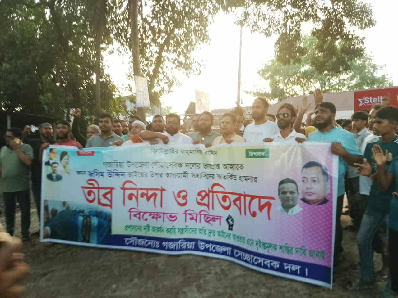 মুন্সিগঞ্জ গজারিয়ায় উপজেলা স্বেচ্ছাসেবক দলের ভারপ্রাপ্ত আহবায়ক মো:জসিম উদ্দিন এর উপর সন্ত্রাসী হামলার প্রতিবাদে বিক্ষোভ মিছিল ও প্রতিবাদ সভা করেছে উপজেলা স্বেচ্ছাসেবক দল।গজারিয়া উপজেলার ভবেরচরস্থ থানার নতুন গেটের সামনে থেকে বিক্ষোভ মিছিলটা বের হয়ে বাসষ্টান্ড হয়ে পুর্নরায় থানার পুরাতন গেটে এসে প্রতিবাদ সভা করে।উপজেলা স্বেচ্ছাসেবক দলের সদস্য সচিব মহিবুর রহমান রিফাত এর নেতৃত্বে অন্যান্যদের মাঝে উপস্থিত ছিলেন তারেক সরকার,মারুফ মিয়াজী, সুমন বেপারী, বাবু সরকার, শরীফ হোসেন, সোহাগ হোসেন,সুলতান শেখ,মাসুদ রানা প্রমুখ।এ সময় মহিবুর রহমান রিফাত বলেন,উপজেলা স্বেচ্ছাসেবক দলের ভারপ্রাপ্ত আহবায়ক জসিম উদ্দিন একজন পরিচ্ছন্ন রাজনীতিবিদ,তার উপর আওয়ামী সন্ত্রাসীদের হামলা কোন ভাবেই গ্রহণ যোগ্য না,২৪ঘন্টার মধ্যে হামলাকারীদের গ্রেফতার করা না হলে ঢাকা চট্টগ্রাম মহাসড়ক বন্ধ করে দেওয়া হবে।উল্লেখ্য অদ্য পূর্ব বিরোধের জেরে উপজেলা স্বেচ্ছাসেবক দলের ভারপ্রাপ্ত আহবায়ক জসিম উদ্দিন হামলার শিকার হন।জানা যায়,হামলাকারী জসিম উদ্দিন এর আপন মামাতো ভাই মুরাদ,দুইজনের মধ্যে মারামারির ঘটনায় মুরাদও আহত হন।