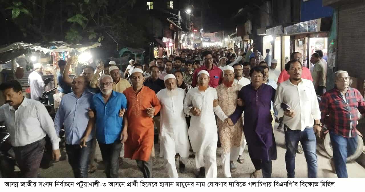 আসন্ন জাতীয় সংসদ নির্বাচনে পটুয়াখালী-৩ (গলাচিপা-দশমিনা) আসনে বিএনপি প্রার্থীর নাম ঘোষণা স্থগিত করেছে।এরই প্রেক্ষিতে এ আসনে দলীয় মনোনয়নপ্রত্যাশী বিএনপি’র কেন্দ্রীয় কার্যনির্বাহী কমিটির সদস্য হাসান মামুনের অনুসারী নেতা-কর্মী ও সমর্থকরা গলাচিপায় বিক্ষোভ মিছিল ও সমাবেশ করেছে। বুধবার সন্ধ্যায় বিক্ষোভ মিছিলটি বের হয়ে শহরের গুরুত্বপূর্ণ সড়কগুলো প্রদক্ষিণ করেন। মিছিল শেষে সমাবেশে বক্তারা বলেন, আগামী জাতীয় সংসদ নির্বাচনে পটুয়াখালী-৩ আসনে বিএনপি’র মনোনয়নপ্রত্যাশী গলাচিপা-দশমিনার গণমানুষের নেতা হাসান মামুনের নাম প্রার্থী হিসেবে ঘোষণা করতে হবে। ঘোষণা না করা পর্যন্ত বিক্ষোভ মিছিল ও সমাবেশসহ আরো কঠোর কর্মসূচি অব্যাহত থাকবে। বিক্ষোভ মিছিল ও সমাবেশের মাধ্যমে তারা কেন্দ্র তথা দলীয় নীতিনির্ধারকদের দৃষ্টি আকর্ষণের চেষ্টা করছে। অবিলম্বে তাদের নেতা হাসান মামুনের নাম প্রার্থী হিসেবে ঘোষণার দাবি জানান তারা।এসময় অন্যান্যের মধ্যে উপস্থিত ছিলেন উপজেলা বিএনপি’র সভাপতি বীর মুক্তিযোদ্ধা মো. সিদ্দিকুর রহমান, সাধারণ সম্পাদক বীর মুক্তিযোদ্ধা আব্দুস সাত্তার হাওলাদার, সহ-সভাপতি আব্দুস সালাম মৃধা,যুগ্ম সাধারণ সম্পাদক মো. মাকসুদ আলম তালুকদার, মো. মাসুম বিল্লাহ, মিয়া মো. মাসুম বিল্লাহ, মো. আমিরুল ইসলাম, সাংগঠনিক সম্পাদক খন্দকার মশিউর রহমান শাহিন, আসাদুজ্জামান সবুজ, দপ্তর সম্পাদক প্রভাষক মো. ফজলুর রহমান, কৃষি বিষয়ক সম্পাদক মো. সাগর খান, সহ-তথ্য ও গবেষণা বিষয়ক সম্পাদক মুনতাসীর মামুন, পৌর বিএনপির সভাপতি মো. মিজানুর রহমান, সাধারণ সম্পাদক মো. জসিম উদ্দিন খান, সাংগঠনিক সম্পাদক মো. জিয়াউর রহমান জিয়া প্রমুখ।
