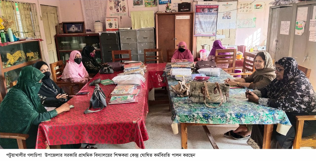 কেন্দ্রীয় কর্মসূচির অংশ হিসেবে পটুয়াখালীর গলাচিপায় ১৯৬ প্রাথমিক বিদ্যালয়ের ৯ শ ১২ জন সহকারী শিক্ষক কর্মবিরতি পালন করছেন। দশম গ্রেডসহ তিন দফা দাবি আদায় ও শাহবাগে পুলিশি হামলার প্রতিবাদে দেশের সকল সরকারি প্রাথমিক বিদ্যালয়ের সাথে একাত্মতা প্রকাশ করে রবিবার থেকে অনির্দিষ্টকালের কর্মবিরতি ঘোষণা দেওয়া হয়। ফলে উপজেলার প্রাথমিক বিদ্যালয়ের শিক্ষকরা কর্মবিরতি পালন করায় প্রায় ২৮ হাজার শিক্ষার্থী পাঠ গ্রহণ থেকে বঞ্চিত হচ্ছে।গলাচিপা উপজেলার শিক্ষক বলেন, আমরা দশম গ্রেডের বাস্তবায়নের লক্ষ্যে শনিবার বিকেলে রাজধানীর শাহবাগে শিক্ষকদের কলম বিসর্জন কর্মসূচি পালন করতে গেলে পুলিশ সাউন্ড গ্রেনেড, টিয়ারশেল ও রাবার বুলেট নিক্ষেপ করলে বহু শিক্ষক আহত হয়ে ঢাকার বিভিন্ন হাসপাতালে ভর্তি আছেন। শিক্ষকদের ওপর পুলিশি হামলার প্রতিবাদে গলাচিপা উপজেলার সব প্রাথমিক বিদ্যালয়ে আমরা অনির্দিষ্টকালের জন্য কর্মবিরতি পালন করছি। আমাদেরগলাচিপা থেকে প্রায় শতাধিক শিক্ষক আন্দোলনে অংশ নিতে ঢাকায় আছেন দাবি আদায় না করা পর্যন্ত আর শিক্ষাপ্রতিষ্ঠানে ফিরবেন না না।গলাচিপার সরকারি প্রাথমিক বিদ্যালয়ের এক সহকারী শিক্ষক বলেন, আমাদের দাবিগুলো সহকারী শিক্ষকদের দশম গ্রেডে বেতন প্রদান, উচ্চতর গ্রেডের জটিলতার স্থায়ী সমাধান ও সহকারী শিক্ষকদের শতভাগ বিভাগীয় পদোন্নতির নিশ্চয়তা প্রদান। আমাদের তিন দফা দাবি বাস্তবায়ন না হওয়া পর্যন্ত কেন্দ্র থেকে ঘোষণা না আসা পর্যন্ত এলাকায় এ কর্মবিরতি অব্যাহত থাকবে।