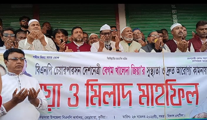 সাবেক প্রধানমন্ত্রী ও বিএনপি চেয়ারপার্সন বেগম খালেদা জিয়ার সুস্থ্যতা ও রোগ মুক্তি কামনায় ভেড়ামারা উপজেলা,পৌর শাখা বিএনপি ও অঙ্গ সহযোগী সংগঠনের উদ্যোগে আজ শনিবার বিকেলে ৪:৩০ মিনিট সময় দক্ষিণ রেলগেটে দোয়া মাহফিল অনুষ্ঠিত হয়।প্রধান অতিথি হিসেবে উপস্থিত ছিলেন- উপজেলা বিএনপির আহবায়ক, উপজেলা পরিষদের সাবেক চেয়ারম্যান ও পৌরসভার সাবেক মেয়র এ্যাডভোকেট তৌহিদুল ইসলাম আলম। ভেড়ামারা পৌর বিএনপির সভাপতি আবু দাউদ এর সভাপতিত্বে অনুষ্ঠিত দোয়া মাহফিল অনুষ্ঠানে উপস্থিত ছিলেন ভেড়ামারা পৌর বিএনপি সাধারণ সম্পাদক শফিকুল ইসলাম ডাবলু, ভেড়ামারা উপজেলা বিএনপির যুগ্ম আহবায়ক জানবার হোসেন, যুগ্ম আহবায়ক আসলাম উদ্দীন, জাহিদুর রহমান রঞ্জু, জুনিয়াদহ ইউনিয়ন বিএনপির সভাপতি আবুল কালাম আজাদ আবুল বিশ্বাস, বাহিরচর ইউনিয়ন বিএনপির সাধারণ সম্পাদক আব্দুর রাজ্জাক, বিএনপি নেতা সাইফুল ইসলাম রোকন, রোকোনুজ্জামান রোকন,মতিউর রহমান দুলাল, সোহেল রানা ভূই বাবু,মজিবর রহমান বাবু মন্ডল সহ দোয়া মাহফিল অনুষ্ঠানে ভেড়ামারা উপজেলা ও বিভিন্ন ইউনিয়ন বিএনপির নেতাকর্মী এবং অঙ্গ সহযোগী সংগঠনের নেতা-কর্মীরা উপস্থিত ছিলেন।