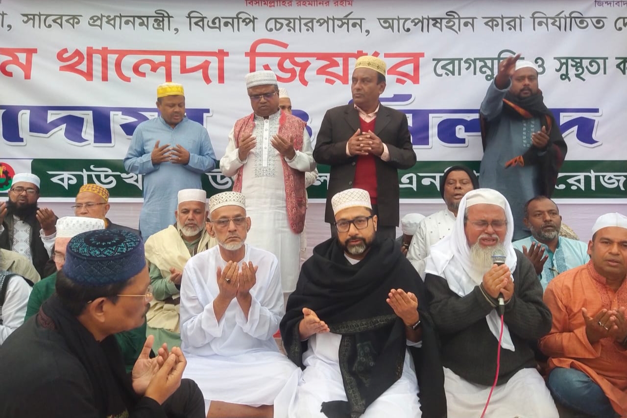 বিএনপির চেয়ারপারসন ও সাবেক প্রধানমন্ত্রী বেগম খালেদা জিয়ার দ্রুত রোগমুক্তি, দীর্ঘায়ু এবং সুস্থতা কামনায় পিরোজপুরের কাউখালীতে বিশেষ দোয়া মাহফিল অনুষ্ঠিত হয়েছে।সোমবার (১ ডিসেম্বর) আছর বাদ পুরাতন কোর্ট বিল্ডিংয়ের সামনে উপজেলা বিএনপির আয়োজনে এ দোয়া মাহফিল অনুষ্ঠিত হয়।কাউখালী উপজেলা বিএনপির সভাপতি এস এম আহসান কবির এর সভাপতিত্বে ও সাধারণ সম্পাদক এইচ এম দ্বীন মোহাম্মদ এর সঞ্চালনায় দোয়া মাহফিলে উপস্থিত ছিলেন পিরোজপুর -২ আসনে বিএনপি মনোনীত প্রার্থী আহমেদ সোহেল মনজুর সুমন, বিএনপির কেন্দ্রীয় কমিটির সদস্য অধ্যক্ষ আলমগীর হোসেন, জেলা বিএনপির সদস্য সচিব মোঃ সাইদুল ইসলাম কিসমত, উপজেলা জামায়াতে ইসলামীর সেক্রেটারির অধ্যাপক হুমায়ুন কবির সহ উপজেলা বিএনপি ও অঙ্গসংগঠনের নেতাকর্মীরা।এ সময় বক্তারা বলেন, দেশনেত্রী বেগম খালেদা জিয়া আপোষহীন নেত্রী। তিনি দেশের মানুষকে আগলে রেখেছেন। এখন তিনি অসুস্থ। আমরা বেগম খালেদা জিয়ার আরোগ্য কামনা করছি। আল্লাহ যেন তাকে দ্রুত সুস্থতা দান করে আমাদের মাঝে ফিরিয়ে দেন।