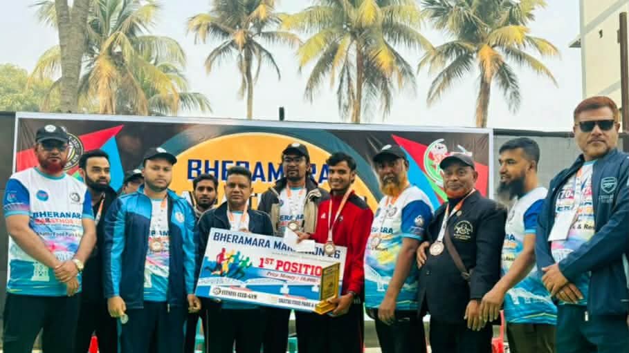 কুষ্টিয়ার ভেড়ামারা সাথী ফুড পার্ক এন্ড রির্সোট ও ফিটনেস ক্লাব-জিমের উদ্যোগে ম্যারাথন দৌড় প্রতিযোগিতা ও পুরস্কার বিতরণ অনুষ্ঠিত হয়েছে।শুক্রবার (২৩শে জানুয়ারি) সকাল সাতটায় উপজেলা চত্বর থেকে বের হয়ে সাত কিলোমিটার ম্যারাথন দৌড়ের পরে আবার উপজেলা চত্বর এসে শেষ হয়। উক্ত অনুষ্ঠানে ভেড়ামারা সাথী গ্রুপের চেয়ারম্যান আনোয়ার হোসেন এর সভাপতিত্বে প্রধান অতিথি হিসেবে উপস্থিত ছিলেন, ভেড়ামারা সহকারী কমিশনার ভুমি ডা: গাজী আশিক বাহার।বিশেষ অতিথি ছিলেন, ভেড়ামারা থানার অফিসার ইনচার্জ (ওসি) মোহাম্মদ জায়েদুর রহমান, ভেড়ামারা সরকারি কলেজের ক্রীড়া বিভাগের প্রধান জাহাঙ্গীর হোসেন জুয়েল প্রমুখ।খুলনা বিভাগীয় প্রেসক্লাব ভেড়ামারা শাখার উপদেষ্টা আব্দুল আলিম এর সঞ্চালনায় ম্যারাথন দৌড় প্রতিযোগিতায় কুষ্টিয়া-২ আসনের বিএনপির মনোনীত প্রার্থী ব্যারিস্টার রাগীব রউফ চৌধুরী,ভেড়ামারা উপজেলা বিএনপির সদস্য সচিব শাহাজাহান আলী সহ প্রায় ৩ শতাধিক সদস্য অংশ গ্রহণ করেন তার মধ্যে নারীরা প্রায় ২৫ জন ছিলেন।পরিশেষে এমন অসাধারণ মনোমুগ্ধকর পরিবেশে আয়োজন সমাপ্ত করায় ধন্যবাদ জ্ঞাপন করেছে অংশগ্রহণকারীরা।