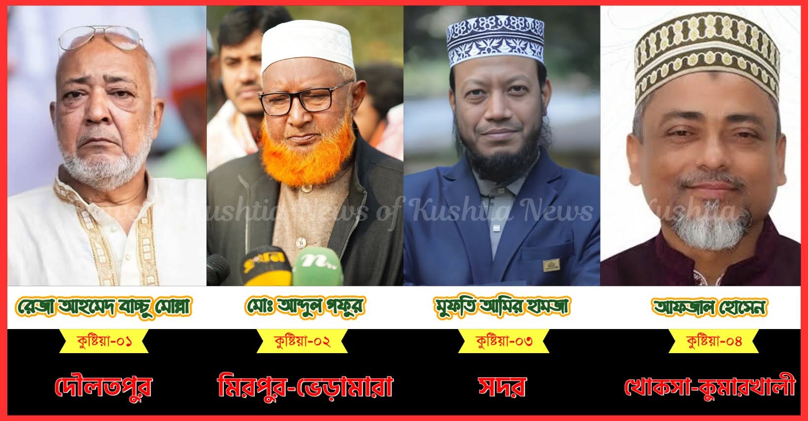 ত্রয়োদশ জাতীয় সংসদ নির্বাচনে কুষ্টিয়ার চারটি আসনের মধ্যে তিনটিতেই বেসরকারি ফলে বিজয়ী হয়েছেন বাংলাদেশ জামায়াতে ইসলামী সমর্থিত দাঁড়িপাল্লা প্রতীকের প্রার্থীরা, আর মাত্র একটি আসনে জয় এসেছে ধানের শীষ প্রতীকের বিএনপি প্রার্থীর ঝুলিতে। পোষ্টাল ভোট বাদে সব কেন্দ্রের প্রাপ্ত ফলাফল বিশ্লেষণে এমন চিত্রই উঠে এসেছে।কুষ্টিয়া-১ (দৌলতপুর) আসনে মোট ১৩৫টি কেন্দ্রে ভোটগ্রহণ হয়। সব কেন্দ্রের ফল অনুযায়ী ধানের শীষ প্রতীকে বিএনপি প্রার্থী রেজা আহমেদ ১,৬৫,০৮৫ ভোট পেয়ে বেসরকারিভাবে বিজয়ী হন। তার নিকটতম প্রতিদ্বন্দ্বী দাঁড়িপাল্লা প্রতীকের প্রার্থী বেলাল উদ্দিন পান ৮৫,০৮৫ ভোট, ফলে এই একমাত্র আসনেই কুষ্টিয়ায় ধানের শীষ প্রতীক আরামদায়ক ব্যবধানে এগিয়ে থাকে।