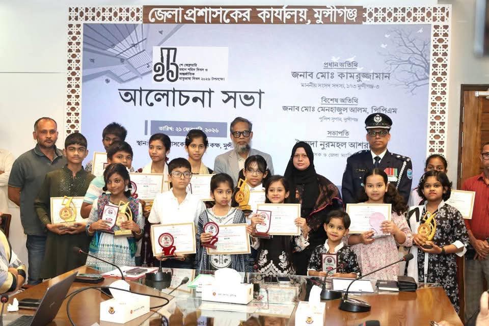 যথাযোগ্য মর্যাদায় মুন্সীগঞ্জে মহান শহিদ দিবস ও আন্তর্জাতিক মাতৃভাষা দিবস ২০২৬ উদযাপিত হয়েছে।শনিবার বেলা ১১টায় জেলা প্রশাসকের কার্যালয়ের সম্মেলন কক্ষে এক আলোচনা সভা ও বিভিন্ন প্রতিযোগিতায় বিজয়ী শিক্ষার্থীদের মাঝে পুরস্কার বিতরণী অনুষ্ঠানের আয়োজন করা হয়। অনুষ্ঠানে সভাপতিত্ব করেন জেলা প্রশাসক সৈয়দা নুরমহল আশরাফী। প্রধান অতিথি হিসেবে উপস্থিত ছিলেন মুন্সীগঞ্জ-৩ আসনের সংসদ সদস্য মো. কামরুজ্জামান।আলোচনা সভায় বক্তারা ভাষা আন্দোলনের ইতিহাস, শহিদদের আত্মত্যাগ এবং মাতৃভাষার মর্যাদা রক্ষায় নতুন প্রজন্মের দায়িত্ব নিয়ে বক্তব্য দেন। তারা বলেন, ভাষা আন্দোলনের চেতনা ধারণ করে দেশের উন্নয়ন ও সাংস্কৃতিক বিকাশে তরুণদের এগিয়ে আসতে হবে।অনুষ্ঠান শেষে প্রধান অতিথি বিভিন্ন প্রতিযোগিতায় বিজয়ী শিক্ষার্থীদের হাতে পুরস্কার তুলে দেন।বিশেষ অতিথি হিসেবে উপস্থিত ছিলেন পুলিশ সুপার মো. মেনহাজুল আলম, জেলা পরিষদের প্রধান নির্বাহী কর্মকর্তা নাজমা নাহার এবং স্থানীয় সরকার বিভাগের উপপরিচালক মৌসুমী মাহবুব।এছাড়াও উপস্থিত ছিলেন অতিরিক্ত জেলা প্রশাসক (সার্বিক) মুহাম্মদ মুছাব্বেরুল ইসলাম, কৃষি সম্প্রসারণ অধিদপ্তরের উপপরিচালক ড. মো. হাবিবুর রহমান, অতিরিক্ত জেলা প্রশাসক (শিক্ষা ও আইসিটি) মো. মাহমুদুর রহমান খোন্দকার, মুন্সিগঞ্জ পৌরসভার প্রধান নির্বাহী কর্মকর্তা মো. তৌহিদুল ইসলামসহ বিভিন্ন দপ্তরের কর্মকর্তা, সরকারি হরগঙ্গা কলেজ ও সরকারি মহিলা কলেজের অধ্যক্ষদ্বয়, এনএসআই-এর যুগ্ম পরিচালক, জুলাই যোদ্ধাবৃন্দ এবং বিভিন্ন শিক্ষাপ্রতিষ্ঠানের শিক্ষক-শিক্ষার্থীরা।