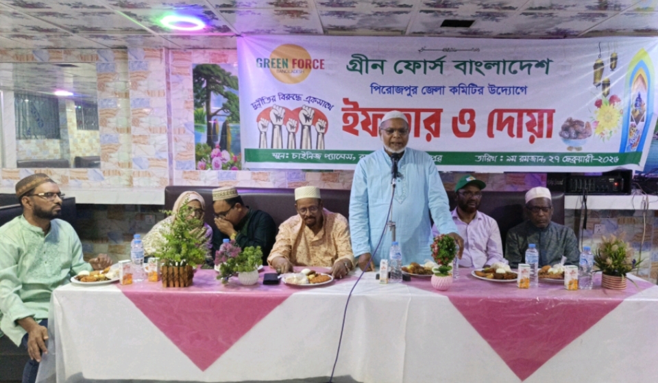 দুর্নীতির বিরুদ্ধে একসাথে শ্লোগানে দুর্নীতিমুক্ত, স্বচ্ছ ও জবাবদিহিমূলক বাংলাদেশ গড়ার লক্ষ্যে গঠিত গ্রীন ফোর্স বাংলাদেশ এর পিরোজপুর জেলা কমিটির উদ্যোগে ইফতার ও দোয়া মাহফিল অনুষ্ঠিত হয়েছে।শুক্রবার (২৭ ফেব্রুয়ারী) বিকালে শহরের চাইনিজ প্যালেসে এ ইফতার ও দোয়া মাহফিল অনুষ্ঠিত হয়। গ্রীন ফোর্স বাংলাদেশের জেলা কমিটির সভাপতি মোঃ মইনুল আহসান মুন্নার সভাপতিত্বে ও সাধারণ সম্পাদক মোঃ নাসির উদ্দীনের সঞ্চালনায় অনুষ্ঠিত ইফতার ও দোয়া মাহফিলে প্রধান অতিথি হিসেবে উপস্থিত ছিলেন, জেলা বিএনপির আহবায়ক মোঃ নজরুল ইসলাম খান। বিশেষ অতিথি ছিলেন পিরোজপুর সরকারী মহিলা কলেজের অধ্যক্ষ প্রফেসর শেখ রফিকুল ইসলাম, দুপ্রক ও সুজনের জেলা কমিটির সম্পাদক সাংবাদিক মনিরুজ্জামান নাসিম, জিপি সৈয়দ সাব্বির আহমেদ, জেলা আইনজীবী সমিতির সাবেক সাধারন সম্পাদক এ্যাডঃ আহসানুল কবির বাদল। বক্তব্য রাখেন সাবেক কাউন্সিলর মিনারা বেগম, শহিদুল ইসলাম প্রমুখ। এসময় রাজনৈতিক, সাংবাদিক, সুধীজন ও গ্রীন ফোর্সের জেলা কমিটির সদস্যগন উপস্থিত ছিলেন।