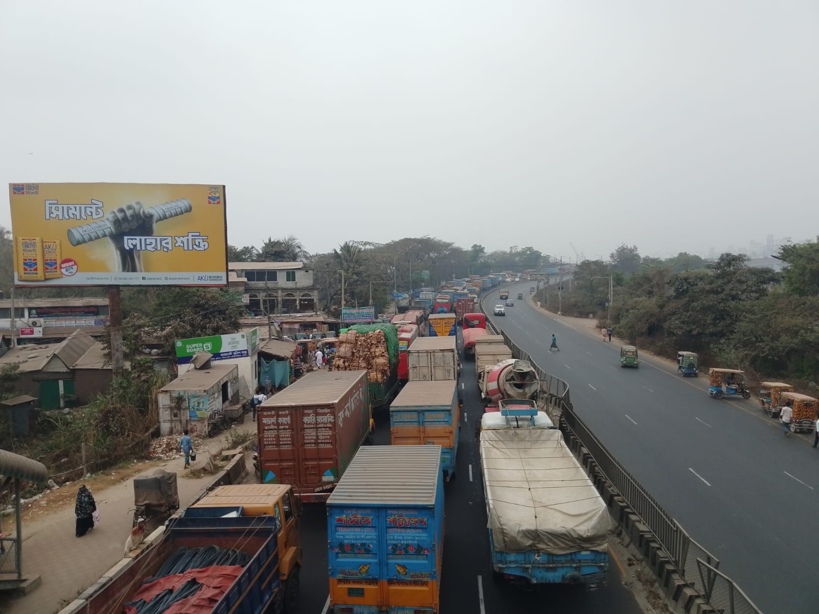 মুন্সীগঞ্জে গজারিয়া উপজেলা ঢাকা-চট্টগ্রাম মহাসড়কের ঢাকামুখী লেনে তীব্র যানজটের সৃষ্টি হয়েছে। দীর্ঘ সময় যানজটে আটকে থেকে চরম দুর্ভোগ পোহাতে হচ্ছে সাধারণ যাত্রী ও চালকদের। খোঁজ নিয়ে জানা যায় দিবাগত মধ্যরাত থেকে নারায়ণগঞ্জের সোনারগাঁও অংশের লাঙ্গলবন্দ সেতুর সংস্কার কাজ শুরু হয়েছে। সেতুর ওপর দিয়ে যানবাহন চলাচলে ধীরগতি তৈরি হওয়ায় এর প্রভাব পড়ে পুরো মহাসড়কে।সময় বাড়ার সঙ্গে সঙ্গে সোনারগাঁও অংশের সেই যানজট গজারিয়া অংশেও ছড়িয়ে পড়ে।ঢাকাগামী কভার ভ্যান চালক আনোয়ার হোসেন জানান, সকাল ৬ টায় দাউদকান্দি ব্রীজ পার হওয়ার পর থেকেই তিনি যানজটে আটকা পড়েন। দীর্ঘ তিন-চার ঘন্টা সময় পার হলেও এখনো মেঘনা ব্রীজ পার হতে পারেন নি। মাইক্রোবাস চালক রফিকুল ইসলাম বলেন, মহাসড়কের গজারিয়া অংশের ঢাকামুখী লেনের প্রায় ১৩ কিলোমিটার এলাকা কার্যত স্থবির হয়ে আছে। কুমিল্লামুখী লেনে যানবাহন চলাচল কিছুটা স্বাভাবিক থাকলেও ঢাকামুখী লেনে তিন ঘণ্টা বসে থেকেও মেঘনা ব্রিজ পার হতে পারিনি। অথচ স্বাভাবিক সময়ে এই পথটুকু যেতে মাত্র ৮-১০ মিনিট সময় লাগে।কুমিল্লা থেকে তিশা গাড়ীর ড্রাইভার খোকন বলেন,দশ মিনিটের রাস্তা আসতে তিন ঘন্টা সময় লাগলো,সংস্কার কাজ কি ঈদের আগে কিংবা পরে করা যায় না? ঈদ আসলেই সংস্কার কাজে শুরু হয়, এর ফলে সৃষ্টি হয় দীর্ঘ যানজট, সাধারণ মানুষ পড়ে চরম দূর্ভোগে। এই তিন-চার ঘন্টা যানজটে আটকে থেকে চরম দূর্ভোগে পড়েছে সাধারণ মানুষ। বিশেষ করে বৃদ্ধ, নারী ও শিশুরা। এ প্রসঙ্গে গজারিয়া ভবেরচর হাইওয়ে পুলিশ ফাঁড়ির ইনচার্জ মো. শওকত হোসেন জানান, নারায়ণগঞ্জ অংশে ক্ষতিগ্রস্ত লাঙ্গলবন্দ সেতুর সংস্কার কাজ চলছে। এর ফলে সোমবার মধ্যরাত থেকে ঢাকামুখী লেনে যানজট সৃষ্টি হয় যা পরবর্তী সময়ে গজারিয়া অংশে ছড়িয়ে পড়ে। যানজট নিরসনে হাইওয়ে পুলিশ কাজ করছে বলে জানান তিনি।