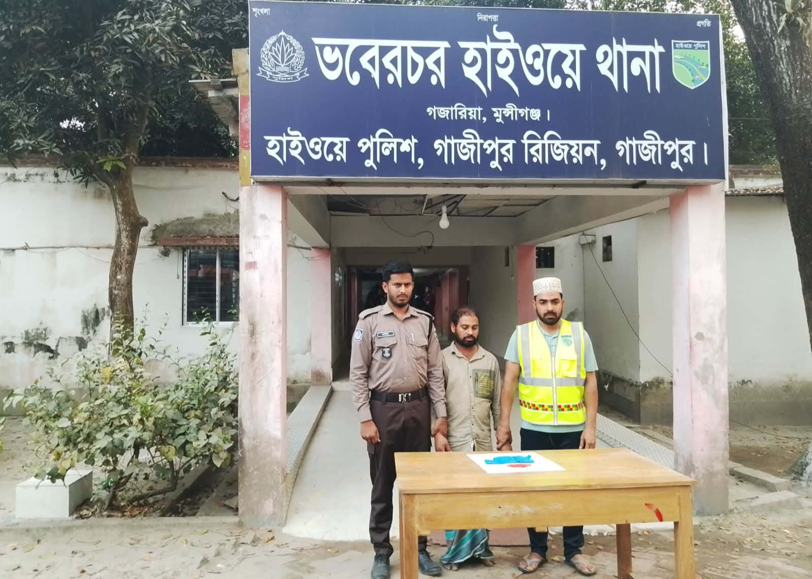 মুন্সীগঞ্জে গজারিয়া উপজেলা ১হাজার পিস ইয়াবাসহ একজনকে আটক করেছে ভবেরচর হাইওয়ে পুলিশ,এ সময় দুই মাদক ব্যবসায়ী পালিয়ে গিয়েছে বলে জানা যায়।গজারিয়ায় উপজেলার ঢাকা চট্রগ্রাম মহাসড়কের বাউশিয়া ইউনিয়ন এর চর বাউশিয়া অংশে ঢাকা মুখী লেনে সন্দেহ ভাজন প্রাইভেট কারে তল্লাসী চালিয়ে এক হাজার পিস ইয়াবা জব্দ ও এ সময় প্রাইভেট কারের চালক আল আমিন(৩২)পিতা শহিদুল্লাহ গ্রাম: চর বাউশিয়া মধ্যম কান্দী(গুচ্ছগ্রাম)উপজেলা গজারিয়া জেলা: মুন্সীগঞ্জকে আটক করা হয় এ সময় এক'ই এলাকার মোয়াজ্জেম এর ছেলে মুন্না(৩৪) ও স্বপন প্রকাশ(৩৫) পিতা:অজ্ঞাত নামে দুই মাদক ব্যবসায়ী পালিয়ে যায়।বিষয়টা নিয়ে ভবেরচর হাইওয়ে পুলিশের উপ পরিদর্শক মো:বাবুল হোসেন জানান,সন্দেহ হওয়ায় প্রাইভেট কারটিকে থামানোর সংকেত দিলে, না থামিয়ে পালানোর চেষ্টা করলে আমরা আটক করতে সক্ষম হই,এ সময় দুজন গাড়ী থেকে লাফিয়ে নেমে দৌড়ে পালিয়ে যায়,আটক ড্রাইভার আল আমিন জিজ্ঞাসাবাদে পালিয়ে যাওয়া দুই মাদক ব্যবসায়ী নাম পরিচয় নিশ্চিত করেছেন।তিনটা ছোট ছোট শিশু সন্তান নিয়ে হাজির প্রাইভেট কারের চালক আল আমিন এর স্ত্রী স্বপ্না আক্তার কান্না জড়িত কন্ঠে জানান,আমরা গরিব মানুষ,সরকারের দেওয়া ঘরে বসবাস করি,রাতে হাসপাতালে যাওয়ার কথা বলে আমার স্বামীকে ডেকে নিয়ে আসে।এ বিষয়ে ভবেরচর হাইওয়ে থানার অফিসার ইনচার্জ মো:শাহ আলম আকন্দ বলেন,চলমান মাদক বিরোধী অভিযানের অংশ হিসেবে আমাদের এই কার্যক্রম,এ বিষয়ে মামলা দায়ের প্রক্রিয়াধীন।