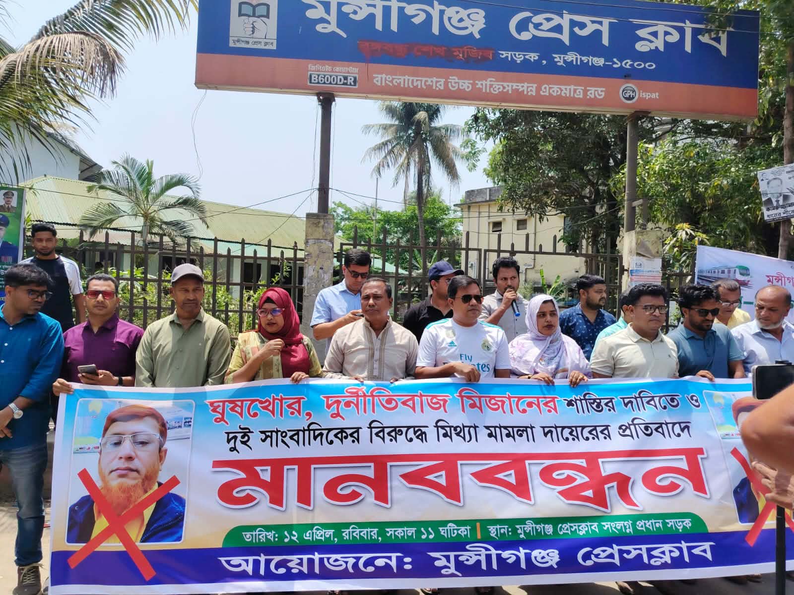 মুন্সীগঞ্জে সাংবাদিকের বিরুদ্ধে মিথ্যা মামলা প্রত্যাহার দাবিতে বিক্ষোভ ও মানববন্ধন এবং প্রশাসনকে অভিযুক্ত ঘুষ গ্রহণকারী কর্মচারীর বিরুদ্ধে ব্যবস্থা নিতে সাত দিনের সময় বেধে দিয়েছে মুন্সীগঞ্জের সংবাদকর্মীরা।মুন্সীগঞ্জ প্রেসক্লাবের আয়োজনে প্রেসক্লাবের সামনে প্রধান সড়কে এ মানববন্ধন অনুষ্ঠিত হয়। এ মানববন্ধনে মুন্সীগঞ্জ জেলার সকল সাংবাদিক সংগঠনের সদস্য ও সচেতন নাগরিকগণ উপস্থিত ছিলেন।এসময় সাত কর্ম দিবসের মধ্যে ঘুষ গ্রহণ কর্মচারীর বরখাস্তের দাবী জানানো হয়। নয়ত, মুন্সীগঞ্জের প্রশাসন ও সিভিল সার্জন কার্যালয়সহ সকল দপ্তরের সংবাদ উপস্থাপন বন্ধ করে দেওয়ার আলটিমেটাম দেওয়া হয়।জানা যায়, মুন্সীগঞ্জ সিভিল সার্জন কার্যালয়ে ষ্টেনোগ্রাফার মিজানুর রহানের বিরুদ্ধে ঘুষ গ্রহণের ভিডিওসহ সংবাদ প্রকাশ করায় এনটিভি'র মুন্সীগঞ্জের স্টাফ রিপোর্টার ও স্থানীয় দৈনিক মুন্সীগঞ্জের সময় পত্রিকার প্রকাশক ও সম্পাদক মইনুদ্দিন আহম্মেদ সুমন এবং দৈনিক বাংলাদেশ প্রতিনিধি পত্রিকার মুন্সীগঞ্জ প্রতিনিধি আবু সাঈদ দেওয়ান সৌরভ। এ ঘটনাকে ধামাচাপা দিতে দুই সাংবাদিকের বিরুদ্ধে ঘুষখোর স্টেনোটাইপিস্ট মিজানুর রহমান মিথ্যা মামলা দায়ের করেন।মানববন্ধনে বক্তরা বলেন মুন্সীগঞ্জ সিভিল কার্যালয়ে স্টেনোটাইপিস্ট মো মিজানুর রহমান ৩৮ বছরে ঘুষের রাজত্ব কায়েম করেছে। কয়েকবার বদলির পরও একজন তৃতীয় শ্রেণির কর্মচারী একই কর্মস্থলে ৩৮ বছর কিভাবে কাজ করে। মিজানের কাছে মুন্সীগঞ্জের স্বাস্থ্য বিভাগ তার দূর্নীতির কাছে জিম্মি। জেলার এমন কোন ডায়াগনস্টিক সেন্টার ও ক্লিনিক নেই যে তার দূর্নীতির কারণে নির্যাতিত হয়নি। এর সাথে কে বা কারা জড়িত। এ ঘুষের টাকা কারা পান। এর জবাব জেলা প্রশাসককে দিতে হবে৷ মিথ্যা মামলা প্রত্যাহারের দাবী ও হয়রানির তীব্র প্রতিবাদ জানান।সেই সাথে ঘুষ গ্রহনকারী কর্মচারীর চাকরি হতে অব্যাহতির দাবী জানান।মুন্সীগঞ্জ প্রেসক্লাবের সভাপতি আতিকুর রহমান টিপু বলেন, স্টেনোটাইপিস্ট মো মিজানুর রহমানের ৩৮ বছর মুন্সীগঞ্জ সিভিল সার্জন কার্যালয়কে ঘুষের আখড়ায় তৈরি করেছে। ঘুষ নেওয়ার ভিডিও থাকা সত্বেও প্রায় এক মাস পার হলেও কোন ব্যবস্থা নেওয়া হয়নি। সাত দিনের মধ্যে দূর্নীতিবাজ কর্মচারীর ব্যবস্থা নেওয়া না হলে মুন্সীগঞ্জের সকল দফতরের সংবাদ প্রকাশ করা বন্ধ করে দেওয়া হবে বলে হুশিয়ারী দেন।সাধারণ সম্পাদক গোলজার হোসেন বলেন, স্টেনোটাইপিস্ট মো মিজানুর রহমান জেলার চিহ্নিত ঘুষখোর দূর্নীতিবাজ কর্মচারী। তার বিরুদ্ধে ঘুষসহ অসংখ্য অনিমের অভিযোগ রয়েছে। তৃতীয় শ্রেণির কর্মচারী হয়ে কোটি কোটি টাকার মালিক বনে গেছেন। অতি দ্রুত তার বিরুদ্ধে ব্যবস