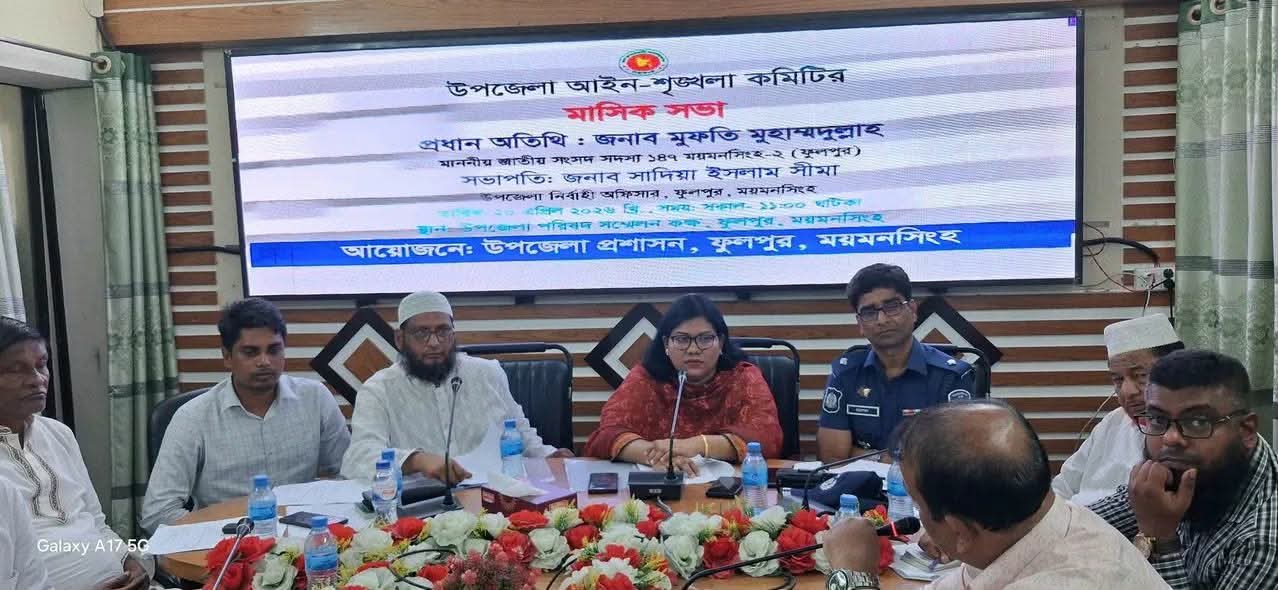ময়মনসিংহের ফুলপুরে আইনশৃঙ্খলা কমিটির মাসিক সভা অনুষ্ঠিত হয়েছে।সোমবার (২০ এপ্রিল) সকালে উপজেলা পরিষদ সভা কক্ষে এ সভা অনুষ্ঠিত হয়।এসময় সভায় প্রধান অতিথি হিসেবে উপস্থিত ছিলেন কমিটির প্রধান উপদেষ্টা মুফতি মুহাম্মদুল্লাহ এমপি।সভাপতিত্ব করেন উপজেলা নির্বাহী অফিসার সাদিয়া ইসলাম সীমা। এসময় সভায় বক্তব্য রাখেন, সহকারী কমিশনার (ভূমি) মোঃ শফিকুল ইসলাম, ফুলপুর থানার ওসি মোঃ রাশেদুল হাসান, ফুলপুর উপজেলা বিএনপির আহ্বায়ক সিদ্দিকুর রহমান সহ কমিটির সকল সদস্যবৃন্দ। এ সময় নেতৃবৃন্দ বলেন শিশুদের হাম, সাপ ও কুকুরের ভ্যাকসিন, ও পৌর এলাকায় ছিঁচকে চুরি, বাস স্ট্যান্ড রাস্তার পাশে গোশতের দোকান, যানযট ,মাদক,ইভটিজিং, এবং তারাকান্দার মত ফুলপুরেও যেন আইনশৃঙ্খলা পরিস্থিতির অবনতি না হয় ওইসব বিষয়ে সতর্ক থাকা সহ বিস্তারিত আলোচনা করা হয়। ফুলপুর উপজেলায় ২৯টি ইটভাটার মধ্যে২৮টি ভাটাই অবৈধ ইটভাটাগুলোর বিষয়ে জরুরি ব্যবস্থা নেওয়ার জন্য গুরুত্বারোপ করা হয়এছাড়াও সভায় অধিকাংশ সদস্য তাদের নিজ বক্তব্যে ফুলপুরের আইনশৃঙ্খলা পরিস্থিতি মোটামুটি ভালো বলে অভিমত ব্যক্ত করেন।